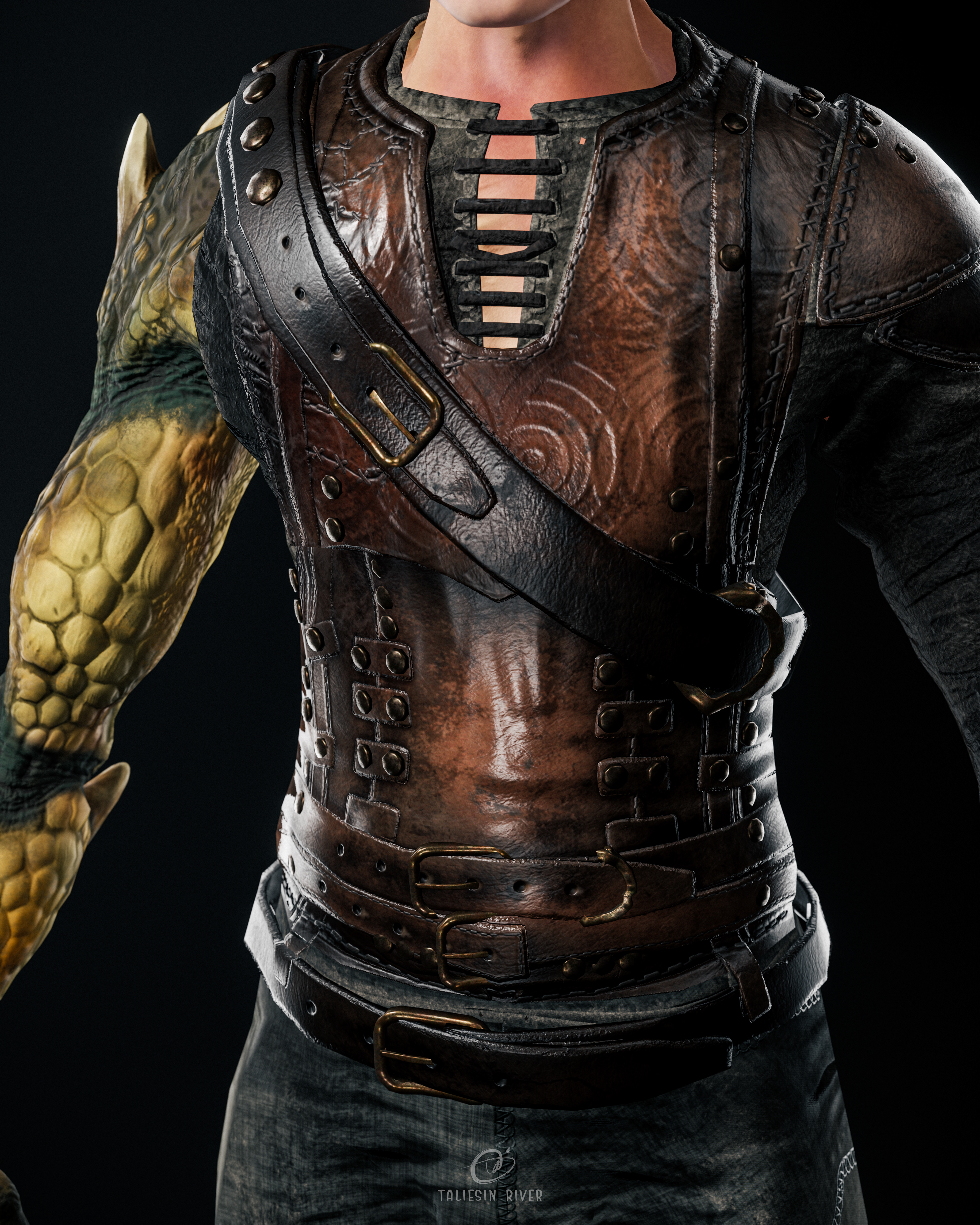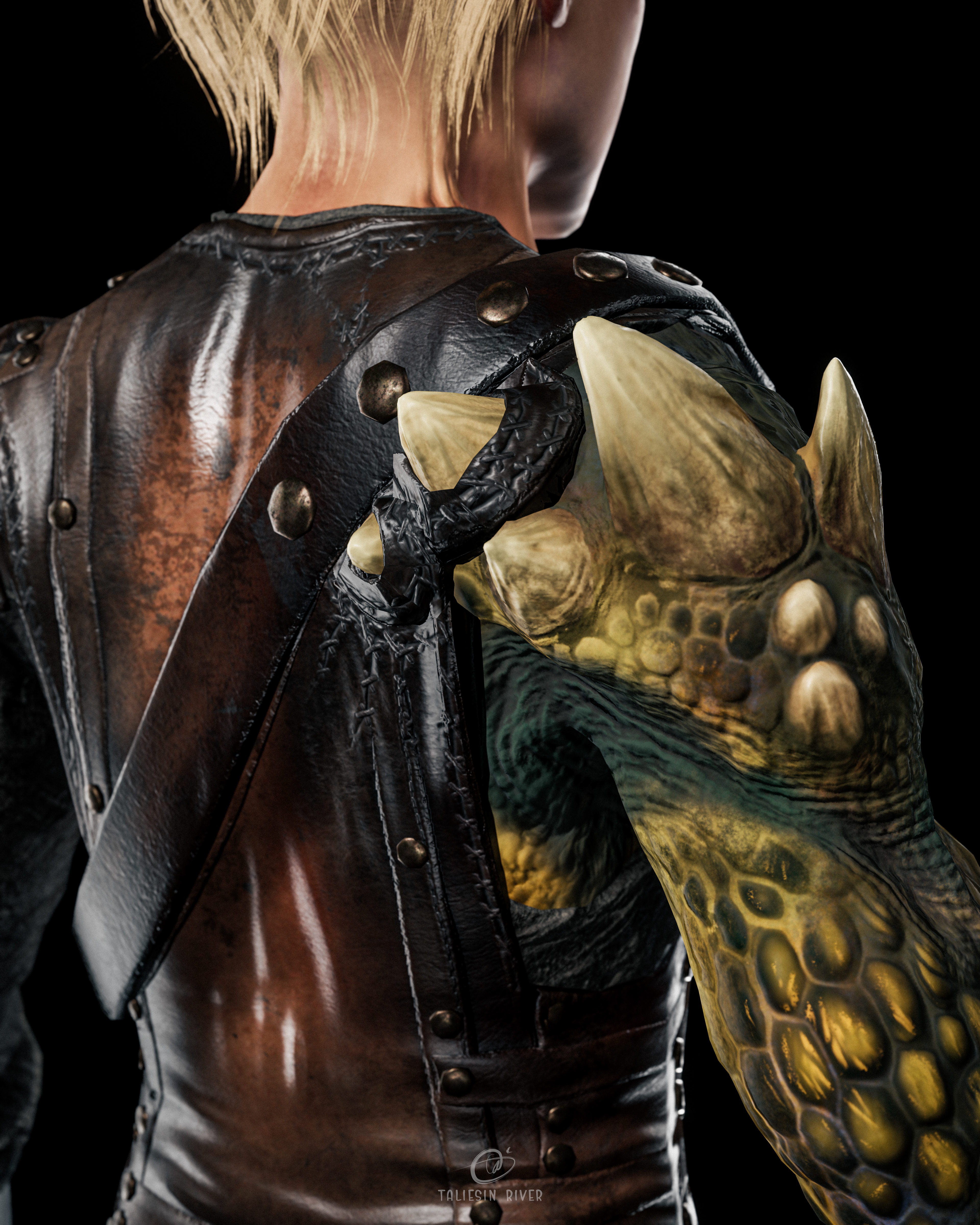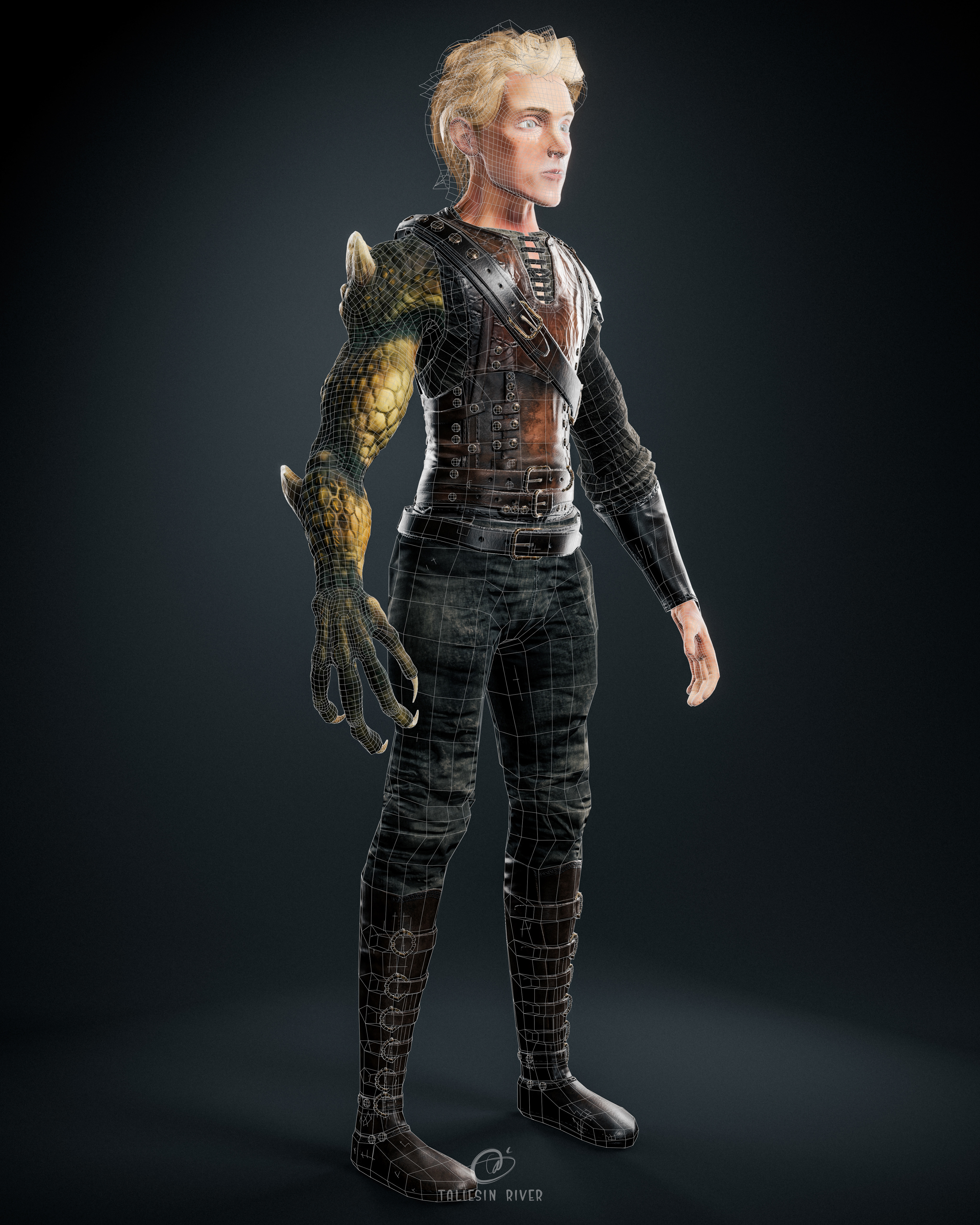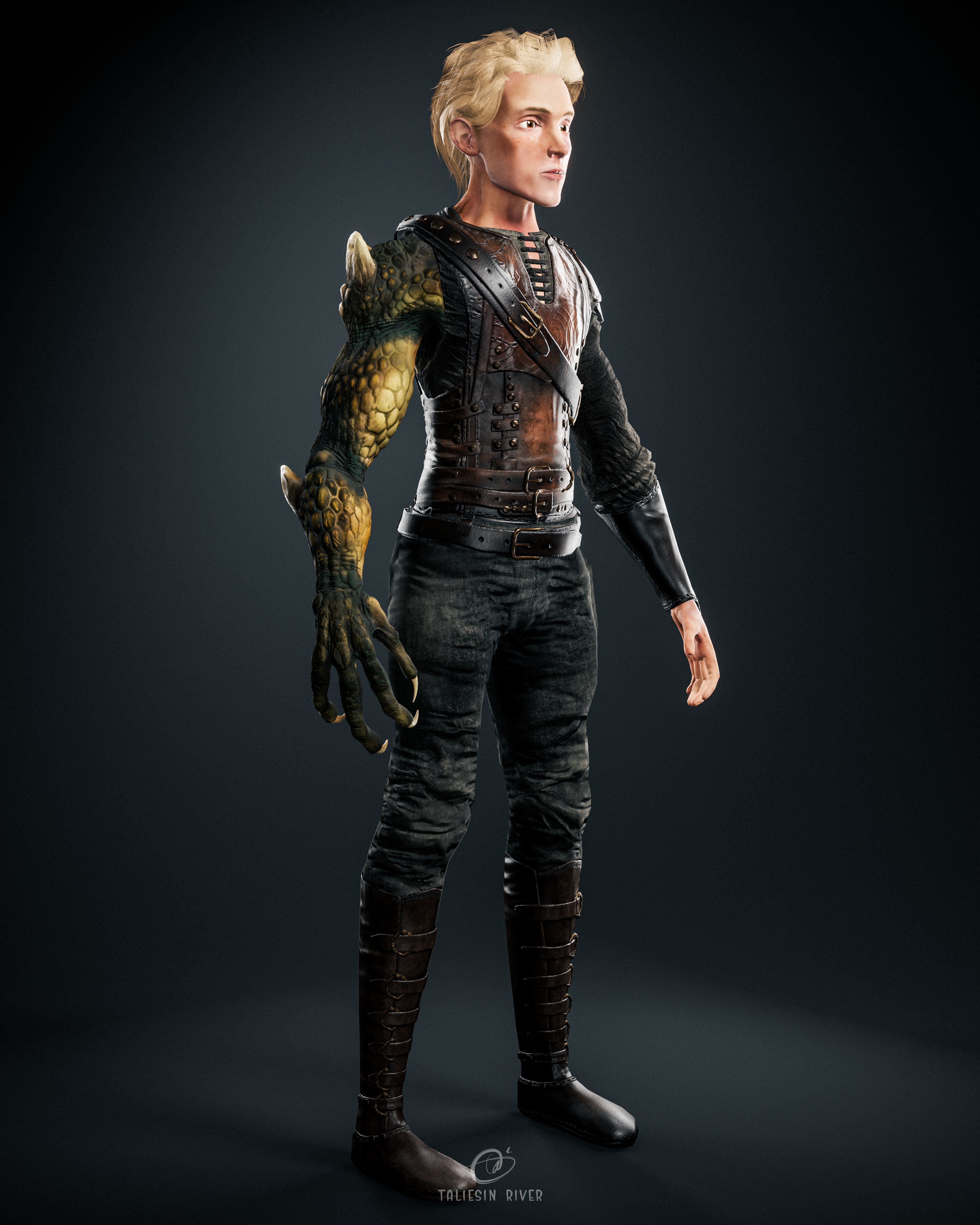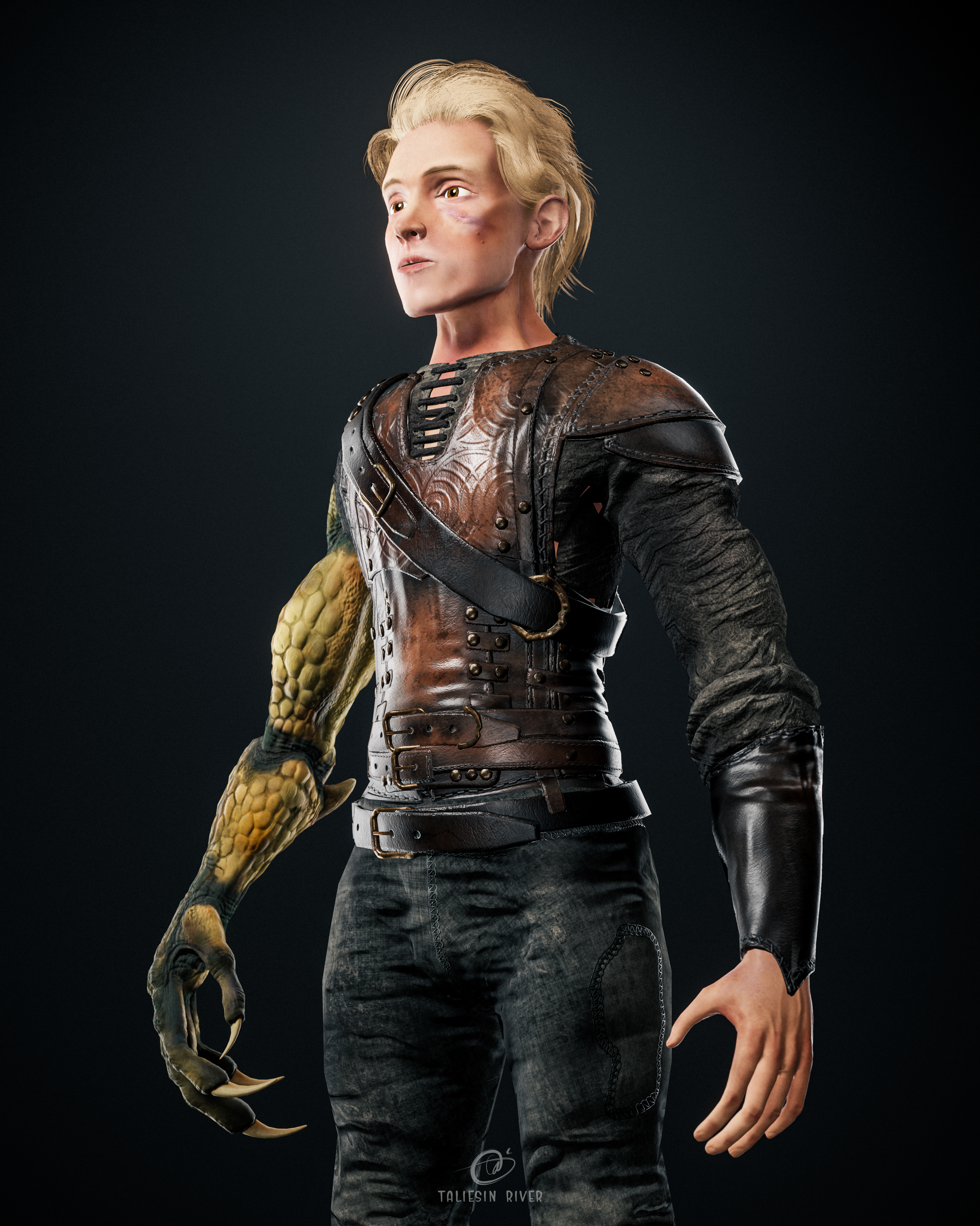 Design wise, the idea behind this character is simple: what if a person in a fantasy world lost an arm, and had it replaced with the arm of a dragon? That was my starting point, and the character evolved from there.