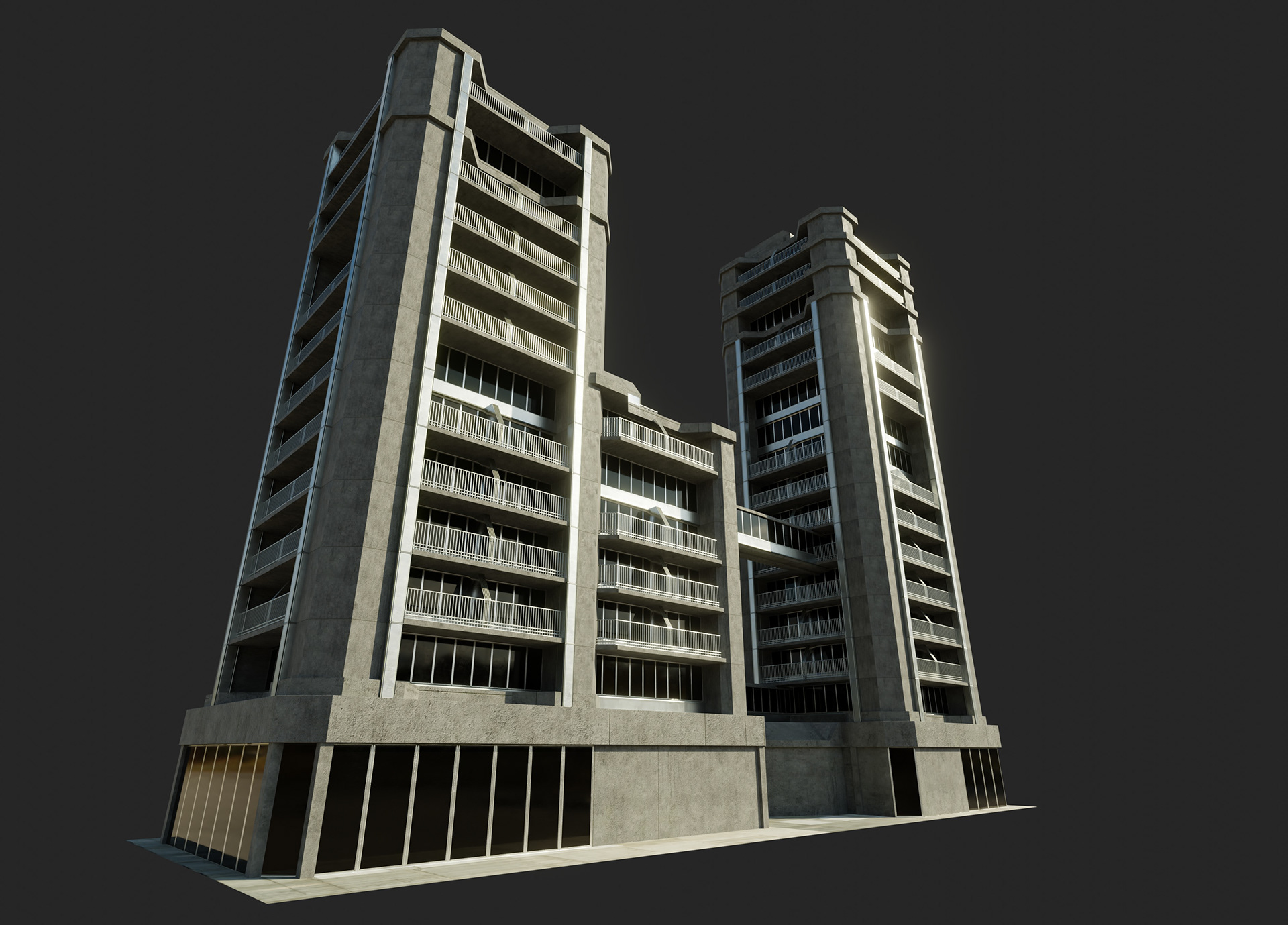 Trim sheet created with Blender and Substance Painter, building assembled and rendered in Blender.